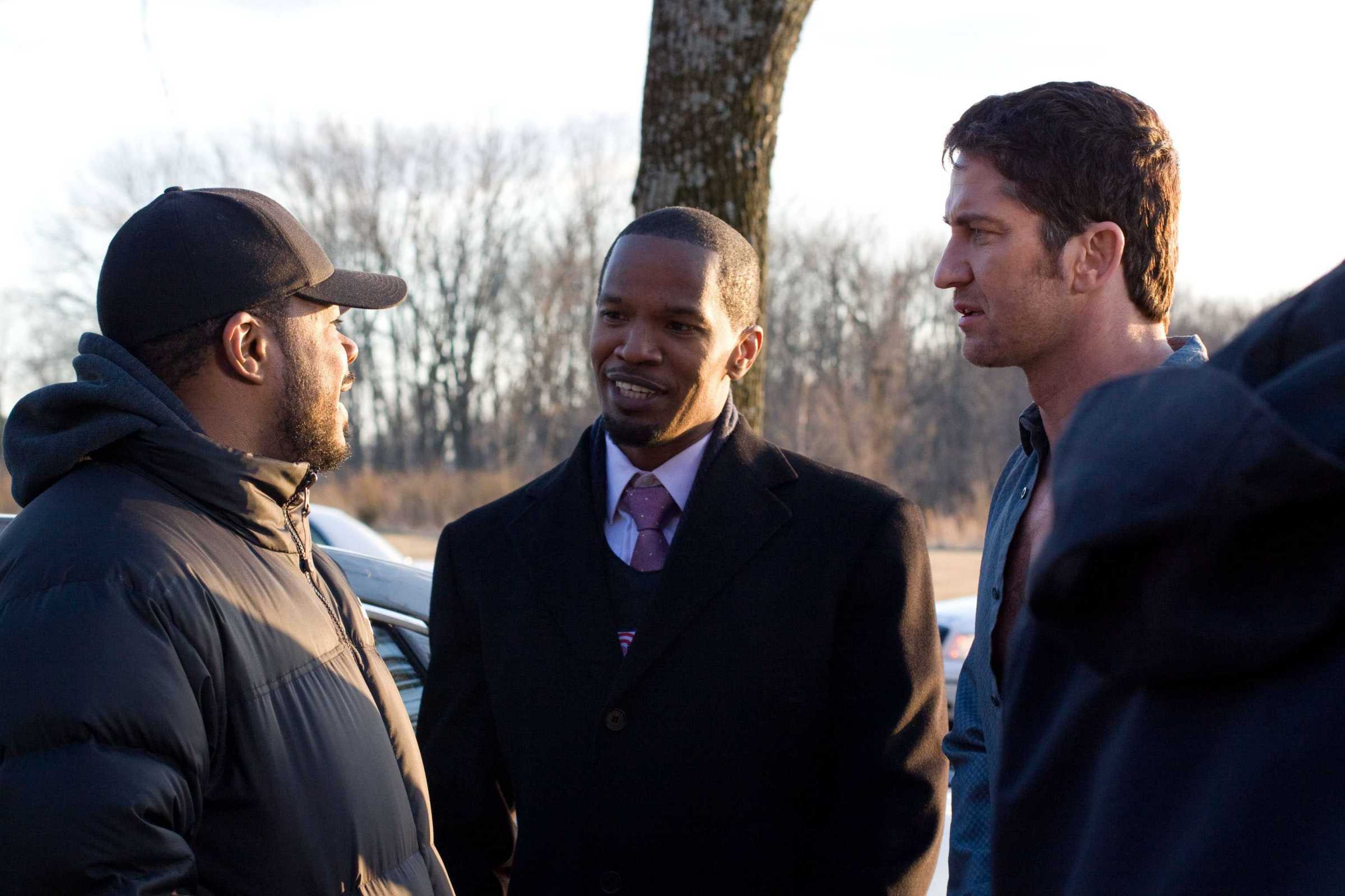 (Left to right.) Director F. Gary Gray on set with Jamie Foxx and Gerard Butler in Overture Filmsâ LAW ABIDING CITIZEN.